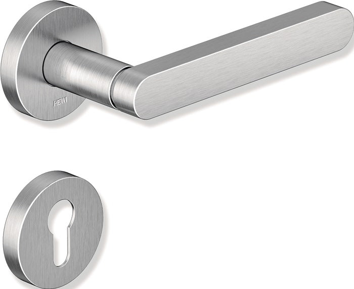 in H-Technik mit Rosetten nach DIN 18255 und DIN EN 1906 aus Edelstahl, Oberfläche matt geschliffen, bestehend aus: Türdrücker Modell 271X... in L-Form aus Edelstahl (1.4301), Ansatz-Durchmesser 21,3 mm, mit Ansatzführung und Rastnut, mit Gewindestift M5 als zusätzliche Fixierung der Türdrücker mit dem Vierkantstift zur optimalen Kraftübertragung in das Türblatt. Montage durch einfaches Einrasten der Türdrücker in die auf der Tür vormontierten Unterteile. Die Rastung kann mittels Demontageschlüssel wieder gelöst werden. Rosetten 305.21X... und 306.23X..., Unterkonstruktion 305.21X... in Kunststoff-Stahlverbundbau mit schwarzer Zink/Nickel-Oberfläche für optimalen Korrosionsschutz, integriertes Hochhaltemodul mit Federunterstützung, DIN links und DIN rechts verwendbar, zur Unterstützung des Schlosses für eine längere Lebensdauer. Festdrehbarlagerung der Drücker mit selbsttätig einrastender Rundumverriegelung und 5 mm Lagerstelle als wartungsfreies Gleitlager mit elastischem Ausgleichsbereich zum Aufheben möglicher Montageungenauigkeiten. Verdeckte, lockerungssichere Verschraubung mit M5 Edelstahlschrauben- und Hülsenschraubenkombination sowie in das Türblatt eintauchenden Stützzapfen. Rosetten-Abdeck-Kappe, rund, aus Edelstahl (1.4301), Durchmesser 55 mm, 10,5 mm hoch, 1,5 mm Wandstärke. Ausgelegt und geprüft für den Objektbereich, Gebrauchs-Kategorie nach DIN EN 1906 - Klasse 4 Garnitur, mit Vierkantstift 8 mm, für Türstärke 38-48 mm · Drückerlänge 150 mm · Zimmergarnitur