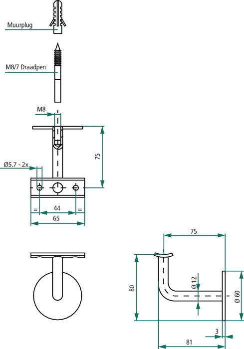 gewölbte Auflage · Wandabstand 75 mm · Wandplatte 60 mm Ø mit Innengewinde M8 · mit Stockschraube und Dübel