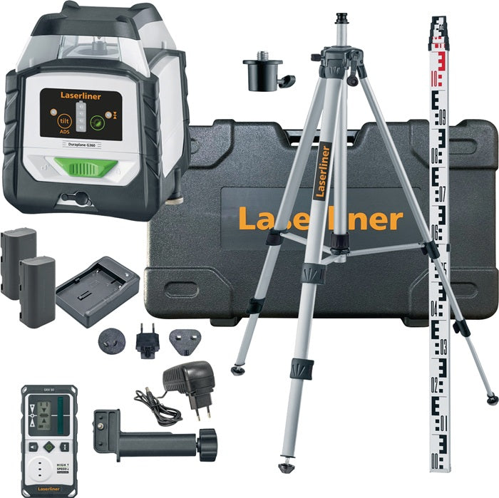 - Duraplane G360, RangeXtender G 60, Kompaktstativ 175 cm, Teleskop-Nivellierlatte 3 m, 5/8″-Gewindeadapter, 2 x Li-Ion Akkupack mit externer Ladestation, Netz-/Ladegerät inkl. internat. Adapter, Tragekoffer
