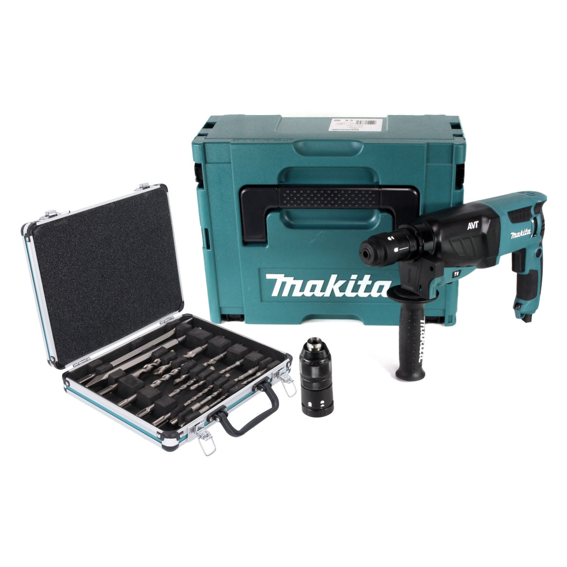 Makita HR 2631 FTJ Kombihammer 800 W 2,4 J SDS Plus + Schnellspannbohrfutter + 13 tlg. Bohrer und Meißel Set + Makpac