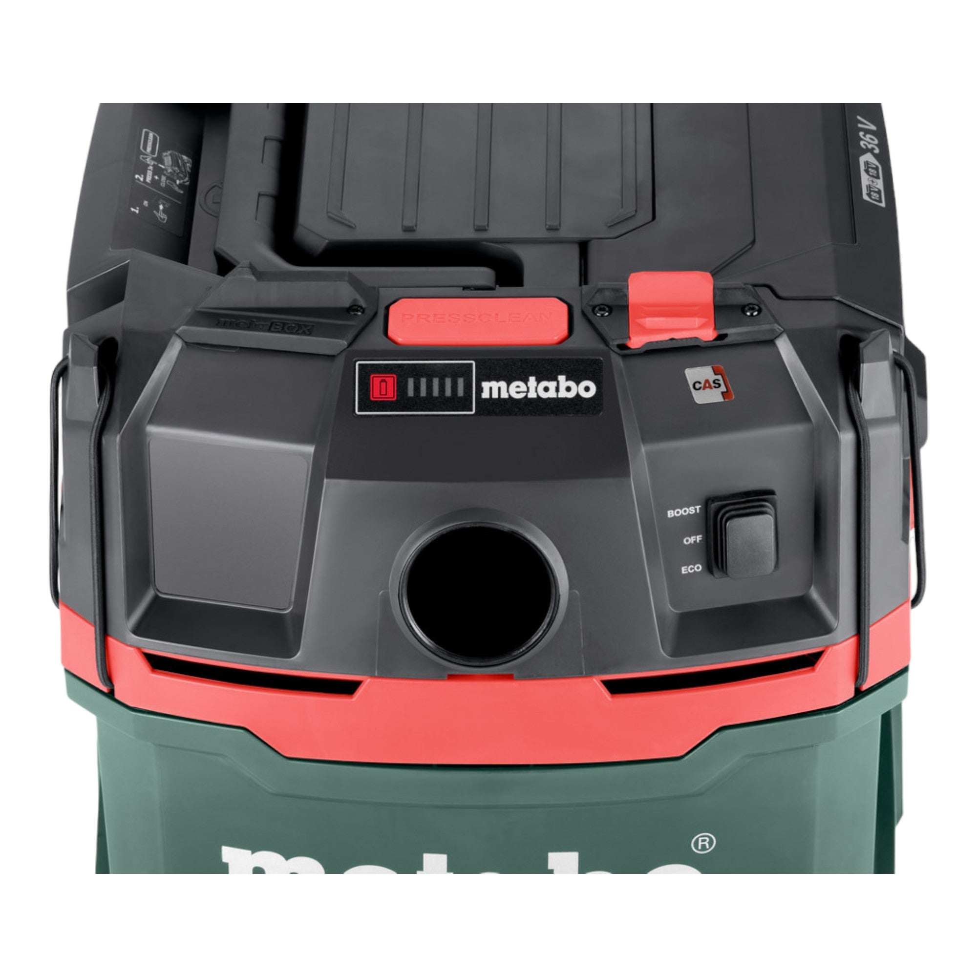 Die PressClean-Funktion ermöglicht eine manuelle Filterabreinigung durch starken Luftstrom bei Schalterbetätigung während der Arbeitspausen. Der Sauger bietet einen Eco-Modus für längere Laufzeiten pro Akkuladung sowie einen Boost-Modus für maximale Leistung. Die Nachlaufautomatik sorgt für das vollständige Entleeren des Saugschlauchs, und ein Saugstopp beim Nasssaugen verhindert Überlaufen bei Erreichen der maximalen Füllhöhe.