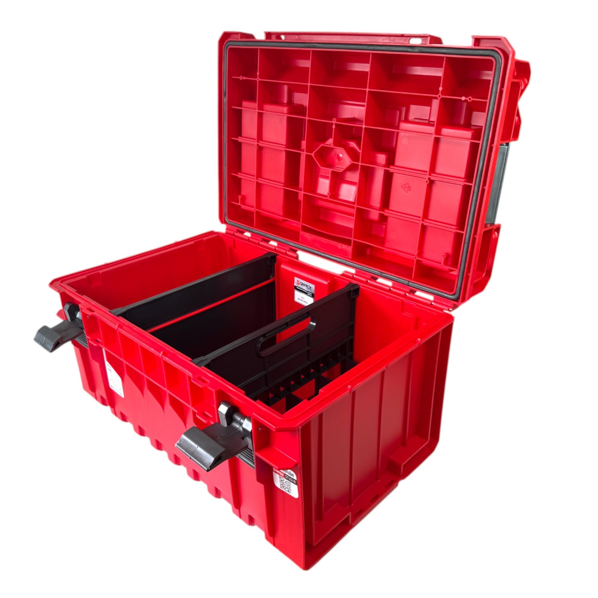 Der ONE 350 ist ein großer Werkzeugkoffer mit einem Fassungsvermögen von 38 Litern. Dank dessen ist es in der Lage, große Elektrowerkzeuge und Handwerkzeuge aufzunehmen. Jede Box ist mit einer flexiblen Dichtung ausgestattet, die vollen Schutz gegen das Eindringen von Staub und Wasser bietet (IP66). Sie ist mit zwei verstellbaren Fächern ausgestattet – ein normales Fach und ein zweites Multi-Fach, das dank der differenzierten Halterungen für Handwerkszeug die Ordnung im Inneren der Box erleichtert. Das herausnehmbare Multifach kann als eigenständiger Werkzeugträger verwendet werden. Der Profi-Deckel ist serienmäßig mit zwei geräumigen Organizern mit beweglichen Trennwänden und stoßfesten Polycarbonat-Schiebern ausgestattet. Die verstärkte Struktur der Abdeckung und des Körpers garantiert eine hohe Tragfähigkeit (50 kg) und hält einem Druck von bis zu 120 kg stand, wodurch komfortable Arbeitsplattformen geschaffen werden können. RED ULTRA HD ist eine Sonderedition von Qbrick System ONE-Produkten aus ultrabeständigem Kunststoff, der sich durch außergewöhnliche Beständigkeit gegen mechanische Beschädigungen auszeichnet. Die durchgeführten Schlagtests bestätigen seine außergewöhnliche Haltbarkeit, auch bei Bedingungen unter 0 °C.