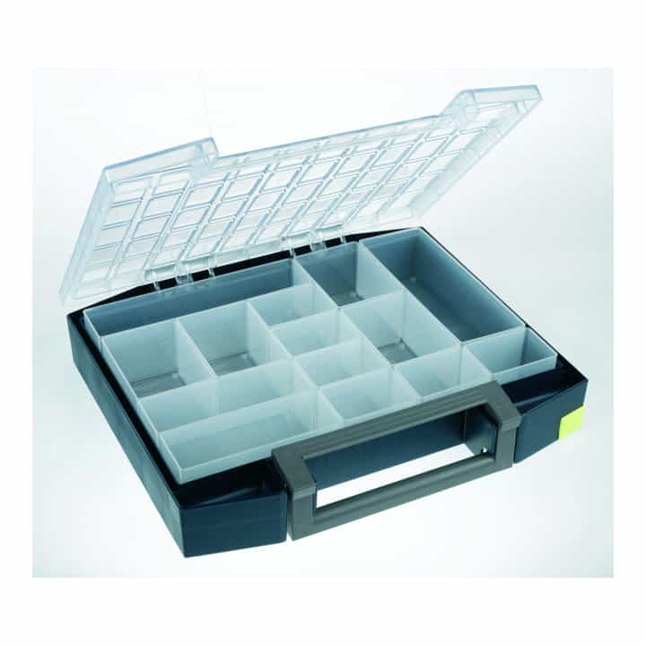 zum effizienten Unterbringen, Lagern und Transportieren Besondere Produktvorteile: · Griff mit integrierter Verriegelungstechnik (Zwangsarretierung des Deckels durch Betätigung des Tragegriffs) · kombinierter Verschlussmechanismus (ermöglicht einhändige Bedienung) · extrem stabile Doppelwandkonstruktion des Kofferbodens aus Polypropylen · Deckel aus bruchsicherem Polycarbonat · robuster, ergonomisch geformter Griff (ausgenommen 4000 871 545) · Profilraster im Deckel und Boden sichern den Kofferinhalt beim Transport · Griff und Scharniere innenliegend (keine scharfen Ecken und Kanten) · integrierte Führungen im Kofferboden (unterstützen das Stapeln der Koffer und schützen die Oberfläche) · austauschbare Identifizierungsetiketten (im Lieferumfang enthalten) · Kennzeichnungsfeld im Deckel · eingearbeitete Stützfüße in der Rückwand (Koffer steht auch hochkant stabil und zuverlässig) · mit herausnehmbaren Fach-Einsätzen Lieferung ohne Inhalt