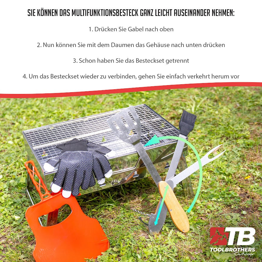 Zusätzlich zu diesem großartigen Grill bieten wir auch ein Paar Grillhandschuhe, Grillfächer und  5 tlg Grillbesteck aus Edelstah. Die kompakten Maße sowie das Gewicht sind ideal für den Outdoorbereich ausgelegt. Egal ob Camping, Picknick oder Strandpartys mit dem Toolbrothers Grill werden alle Satt.