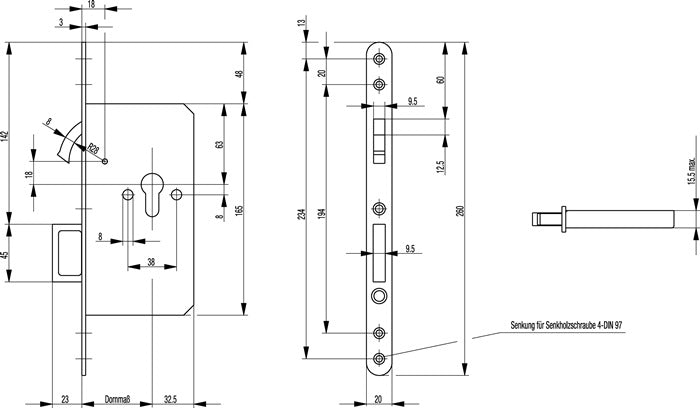 Sliding door lock with spring handle and release button - lock case closed on all sides - faceplate length 260 mm - backset 55 mm - can be used DIN left / right - profile cylinder - with chrome-plated circular bolt - without striking plate