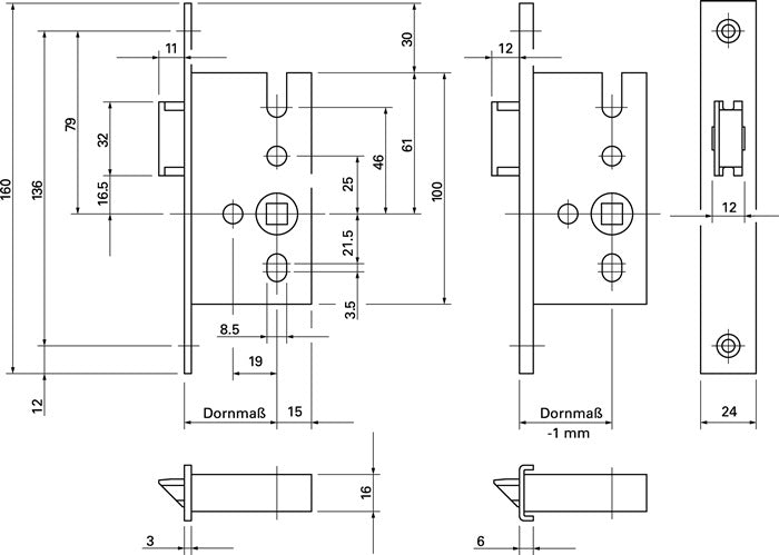 Lock case closed on all sides - square 8 mm - faceplate length 160 mm - reversible latch made of die-cast zinc - without striking plate
