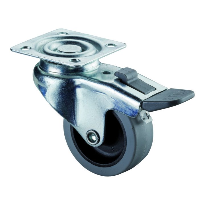 Housing made of sheet steel, galvanised-chromated - single-row ball and cage assembly in the fork head - thermoplastic rubber tyre (grey) - plastic wheel centre - riveted wheel axle - plain bearing - with plate mounting