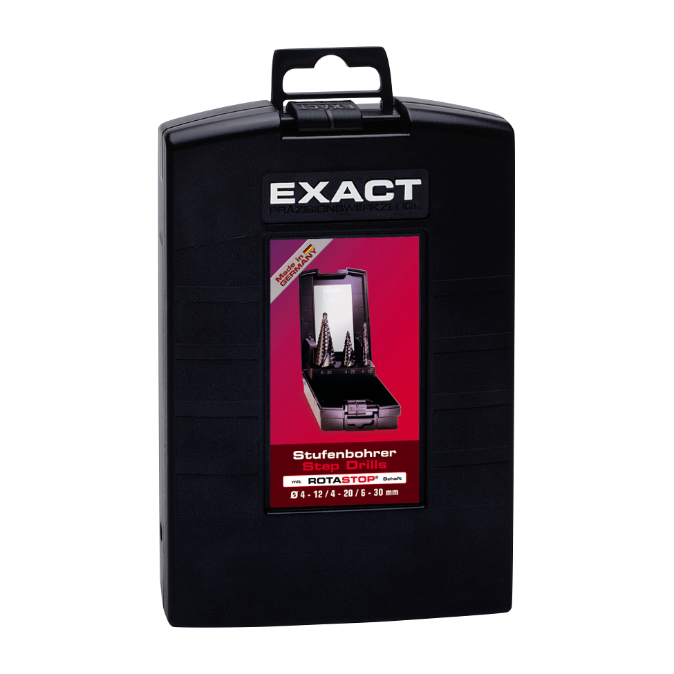 Mit dem 3 teiligen Stufenbohrer Set von EXACT ist das millimetergenaue Bohren gar kein Problem. Mit den Stufenbohrern, die in drei verschiedenen Größen kommen ( 4 - 12; 4 - 20 und 6 - 30 mm ), lässt sich dank der Laserskalierung der Bohrdurchmesser millimetergenau bestimmen. Ein großer Vorteil ist der ROTASTOP Schaft, welcher kein Durchdrehen im Bohrfutter erlaubt, eine optimale Drehmomentübertragung gewährleistet und einen einfachen Werkzeugwechsel garantiert. Die HSS TIALN Bohrer sind mit einer Titan-Aluminium-Nitrit-Beschichtung versehen, um eine optimale Standzeit und höchste Schnittgeschwindigkeiten zu erreichen. Somit weisen Sie eine hervorragende Werkzeugqualität auf und eine sehr hohe Langlebigkeit ist garantiert. Damit sind diese Bohrer für Legierte Stähle mit einer Zugfestigkeit bis unter 1200 N/mm² geeignet. Geliefert wird das Stufenbohrer Set in einer hochwertigen Kunststoffkassette, in der die Bohrer gut sortiert immer schnell griffbereit sind.