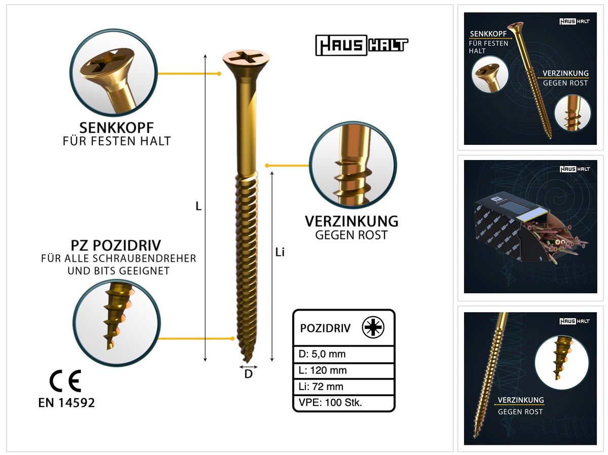 - 100x HausHalt universal wood building screw Wood screw 5.0 x 120 mm PZ2