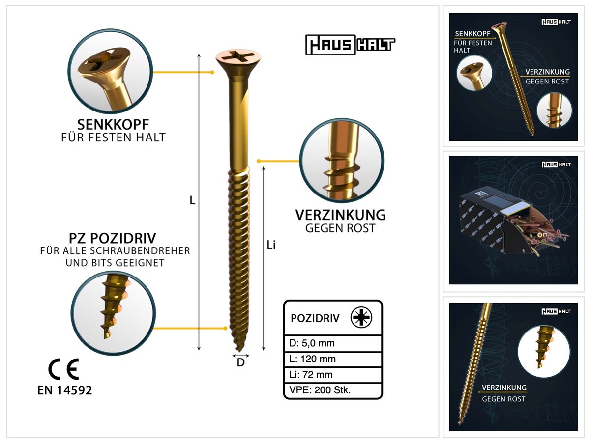 - 200x HausHalt Universal Wood Screws 5.0 x 120mm - PZ2 (2x 000051371186)