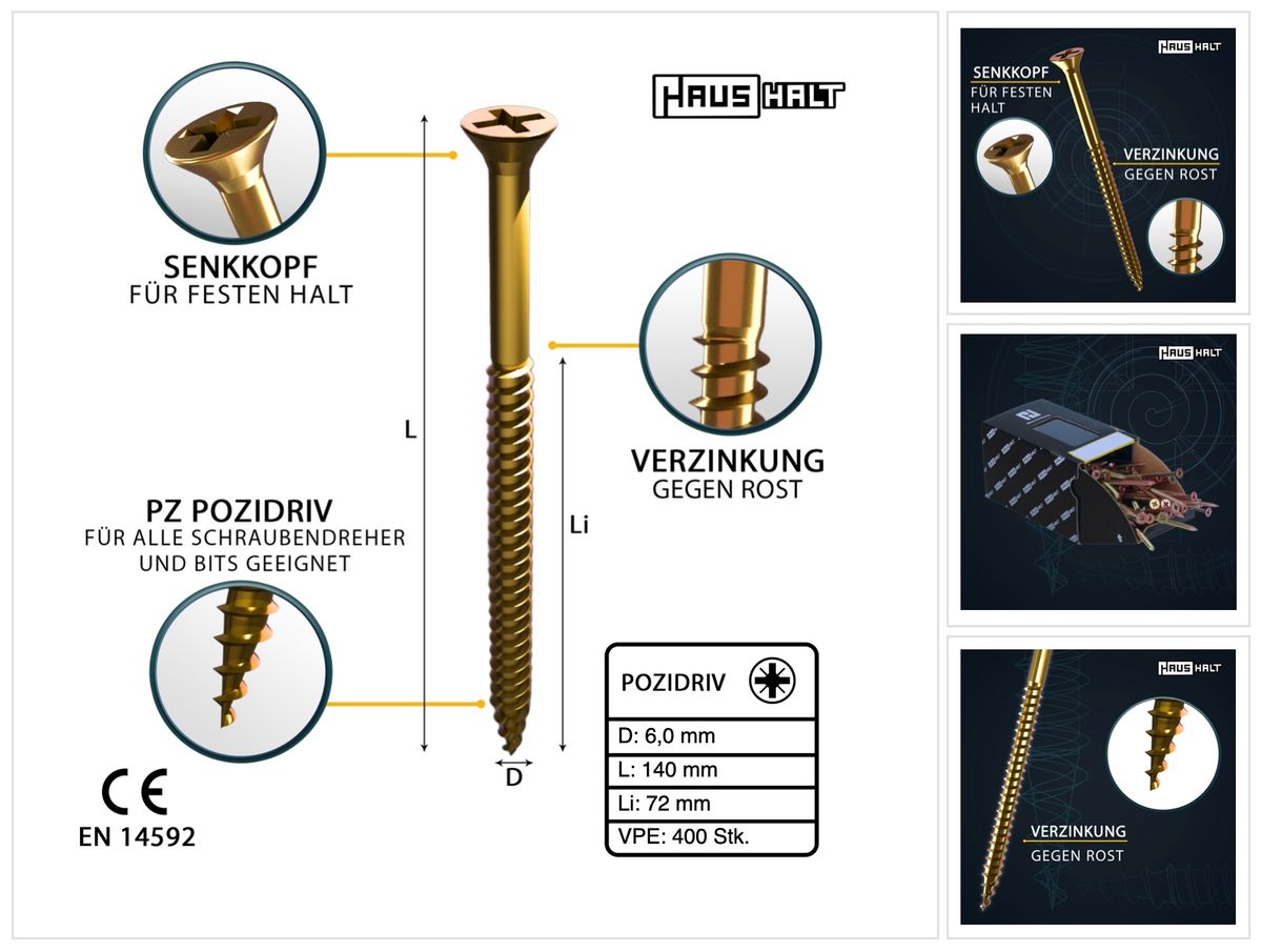 - 400x HausHalt Universal Wood Screws 6.0 x 140 mm - PZ3 (4x 000051371217)