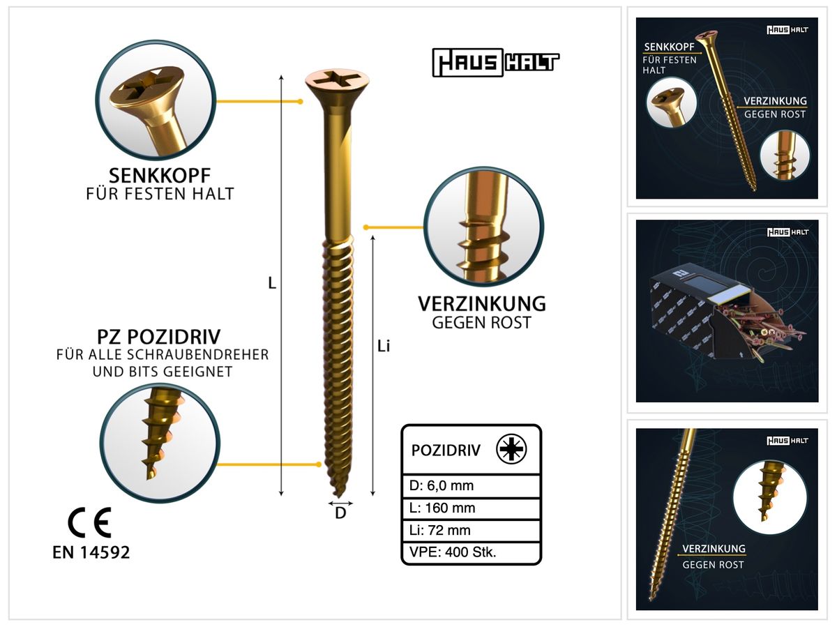 - 400x HausHalt Universal Wood Screws 6.0 x 160mm - PZ3 (4x 000051371220)
