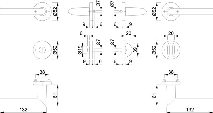 Interior door rosette set tested to DIN EN 1906 (usage category class 3) - Door handles with quick pin connection (with 8 mm solid pin) for door thickness 37-42 mm and return spring - Rosettes with support cams invisibly screwed - Lever handle length for aluminium 132 mm, for stainless steel 131 mm - Stop direction DIN left / right