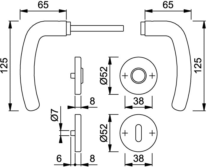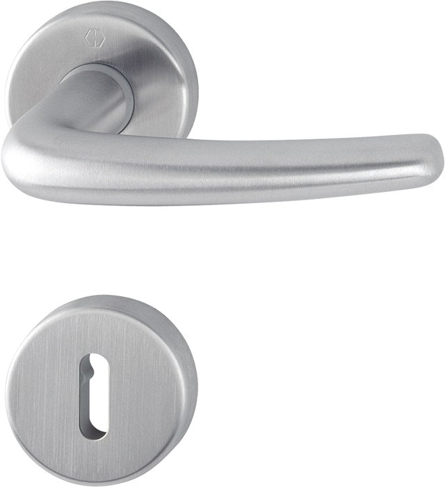 Stainless steel interior door rosette set (door handle set) - tested in accordance with DIN EN 1906 (usage category class 3) - door handle with quick pin connection - rosettes with plastic substructure - return spring and support cams - concealed, continuous screw fitting with self-tapping threaded screws - square 8 mm - for door thickness 37 - 42 mm - hinge direction DIN left / right