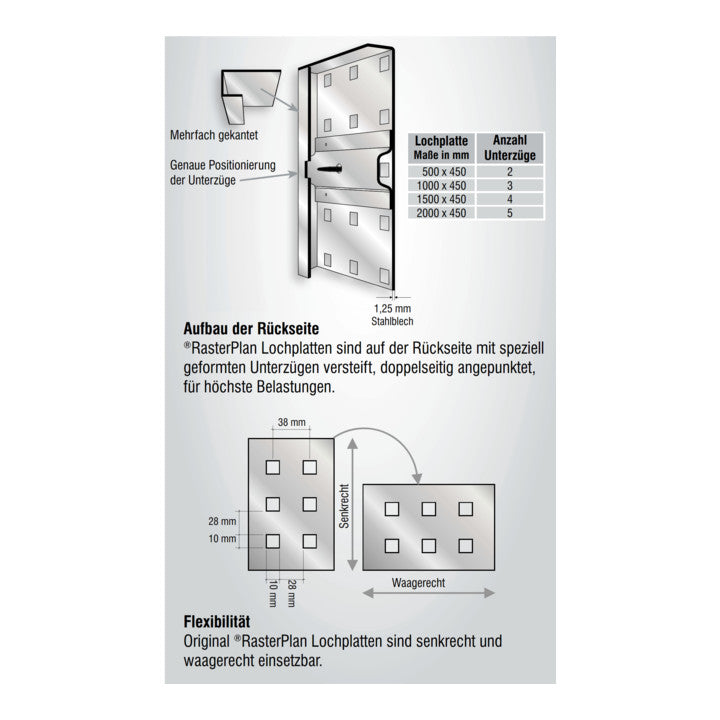 Flexible and expandable - ideal for mounting on walls, workbenches or for use as free-standing partitions - perforated panels made of 1.25 mm thick sheet steel - powder-coated - bevelled all round and reinforced with beams - hole spacing 38 mm - hole size 10 mm²