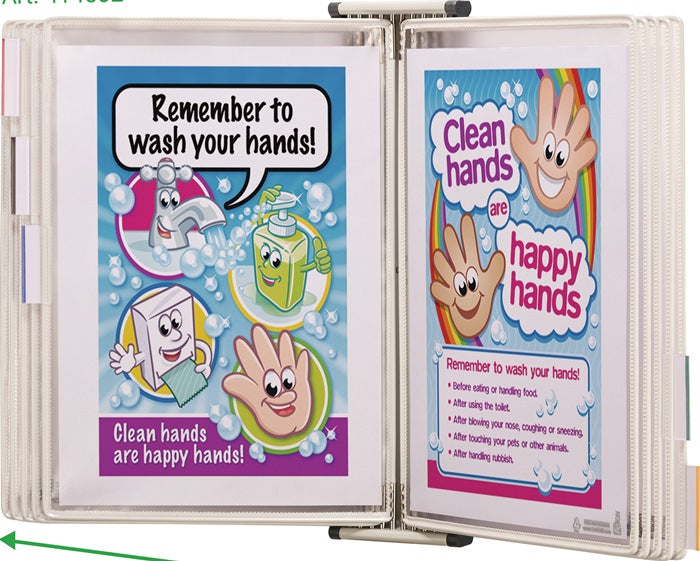 Komplett-Set · Wandhalterung Stahlblech lichtgrau RAL 7035 · mit 10 antimikrobiellen Sichttafeln DIN A4 aus strapazierfähigem, flexiblem PVC, mit kunststoffummanteltem Stahldraht · Öffnung oben · mit 5 Aufsteckreitern 50 mm · mit 4 Pluggers (Anschlagendstücke) für einen idealen Lesewinkel · Aneinanderreihen der Wandelemente in beliebiger Anzahl möglich · inkl. Befestigungsmaterial