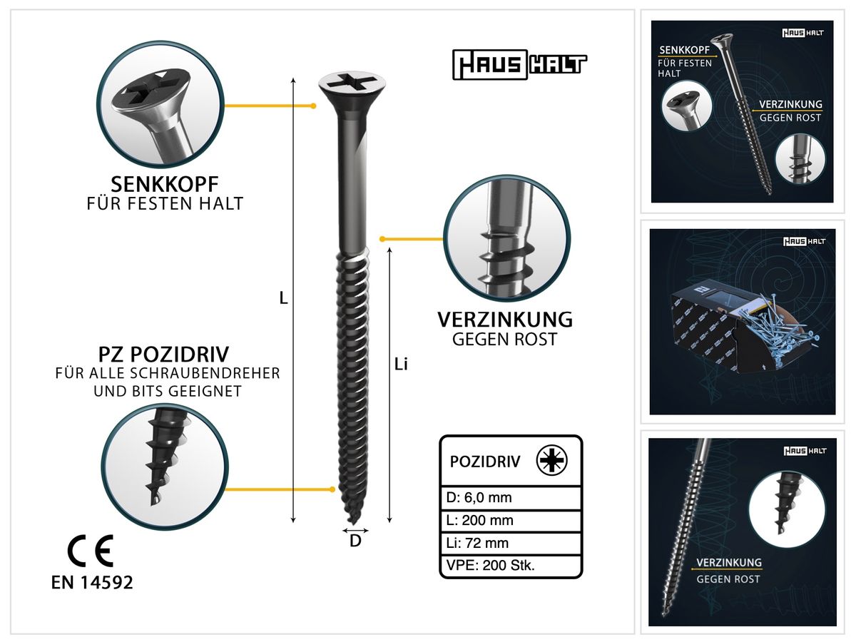 HausHalt Tornillo universal para madera 6,0x200mm - PZ3 - Zincado plateado - Pozidriv cruciforme - Cabeza avellanada - Rosca parcial - 200 unid. (2x 000051371223)