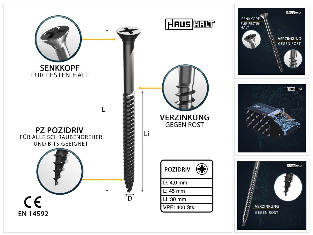 - 400x Tornillos universales para madera HausHalt 4,0 x 45 mm PZ2 (000051371117)