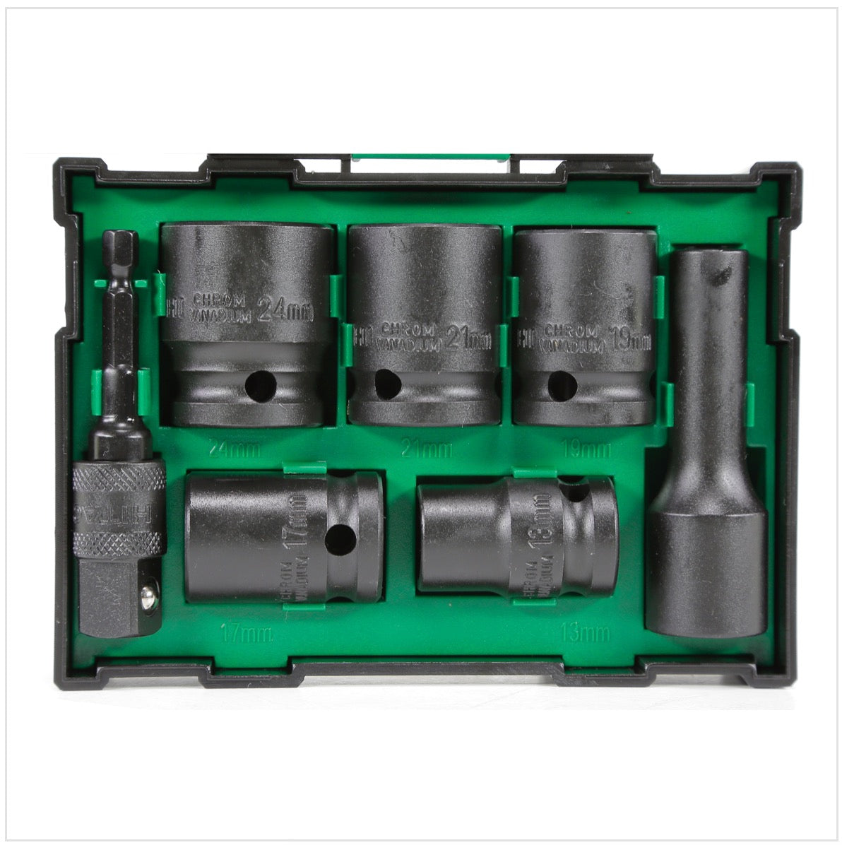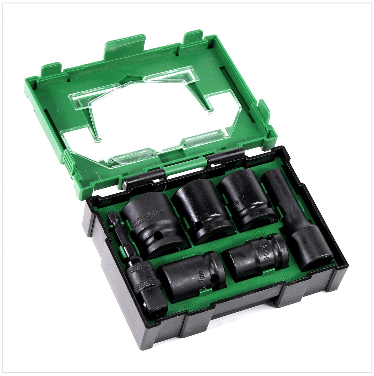Este juego de llaves de vaso de 7 piezas de Hitachi es el accesorio óptimo para su llave de impacto. La robusta caja es fácil de almacenar y se puede apilar con otras cajas Hitachi.