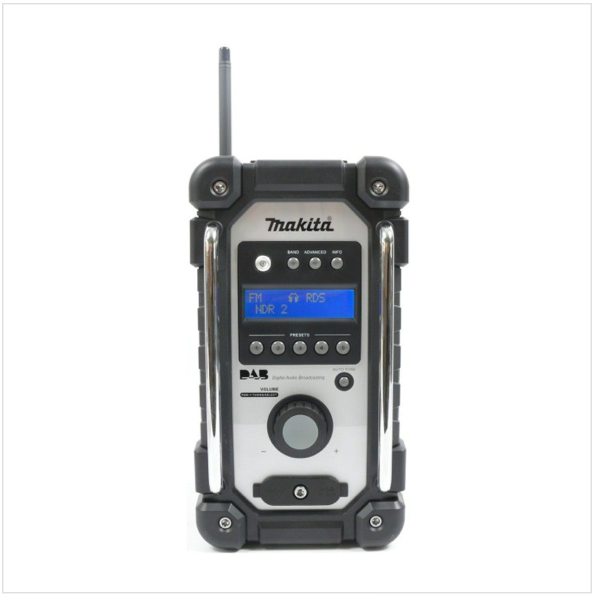 La radio DMR 104 W, perfecta para obras, convence por su alta calidad de sonido de los altavoces estéreo de 3 pulgadas y la robustez de la carcasa. La carcasa, que está equipada con un asa de transporte, está recubierta de goma en los bordes exteriores y todas las aberturas están cerradas y son a prueba de polvo y suciedad. Además, se garantiza la protección contra salpicaduras de agua por todos los lados de acuerdo con IPX 4. La radio de obra recibe los canales de la gama FM / DAB a través de una antena de varilla flexible suministrada. Una gran pantalla LCD con iluminación permite un fácil ajuste manual o totalmente automático del transmisor. La búsqueda del transmisor y el control de volumen se controlan mediante un mando giratorio y reducen al mínimo el manejo de la radio. Se pueden preseleccionar hasta 5 emisoras en cada banda. Si la música que desea no está en la radio, el DMR 104 también tiene conexiones AUX y Micro USB para conectar su iPod, MP3 o reproductor de CD. La radio puede ser operada con baterías estándar Makita de 7.2 - 18 Voltios o con el adaptador de red suministrado.
