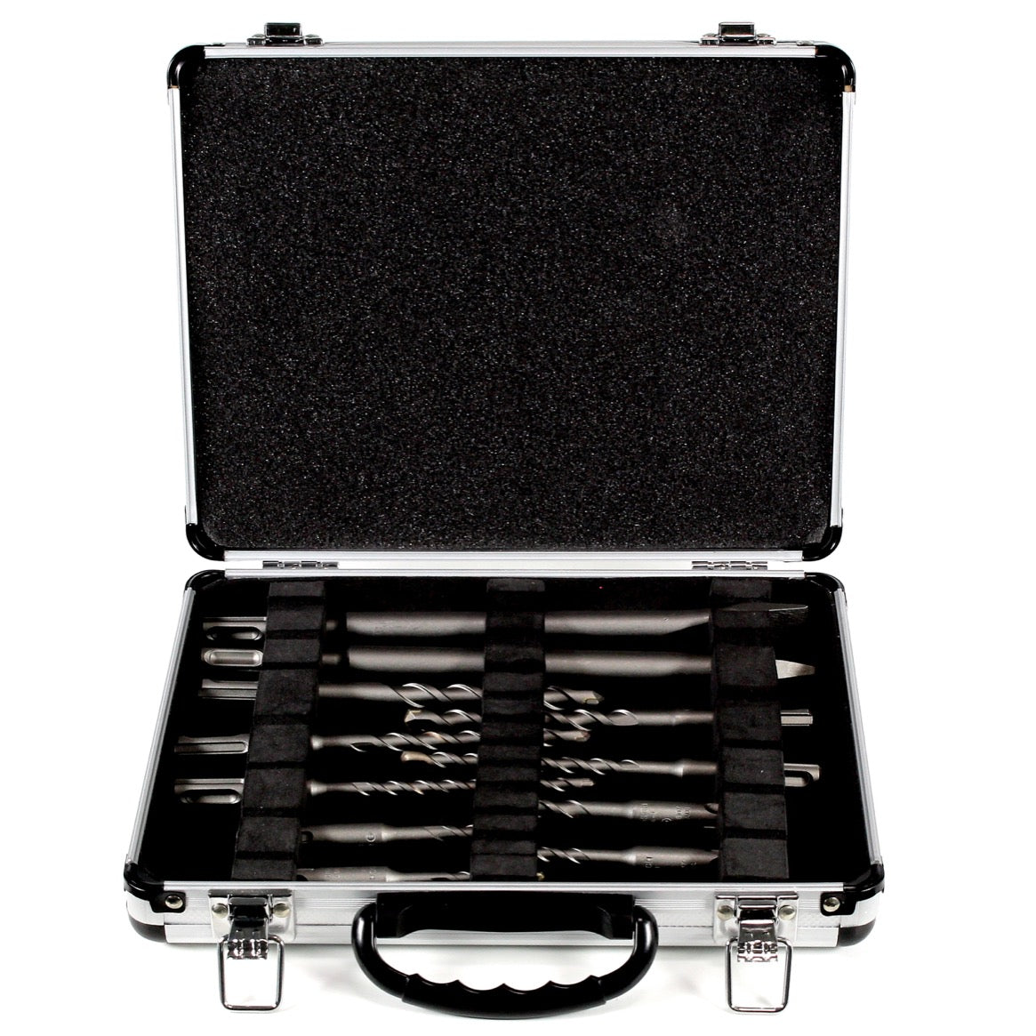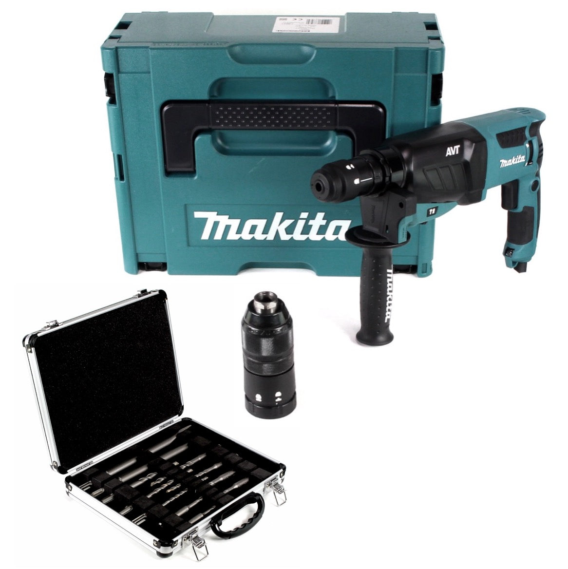 Martillo combinado Makita HR 2631 FTJ 800 W con portabrocas SDS Plus y portabrocas sin llave en Makpac + juego de cinceles y brocas Bosch de 11 piezas para SDS-Plus en maletín de aluminio