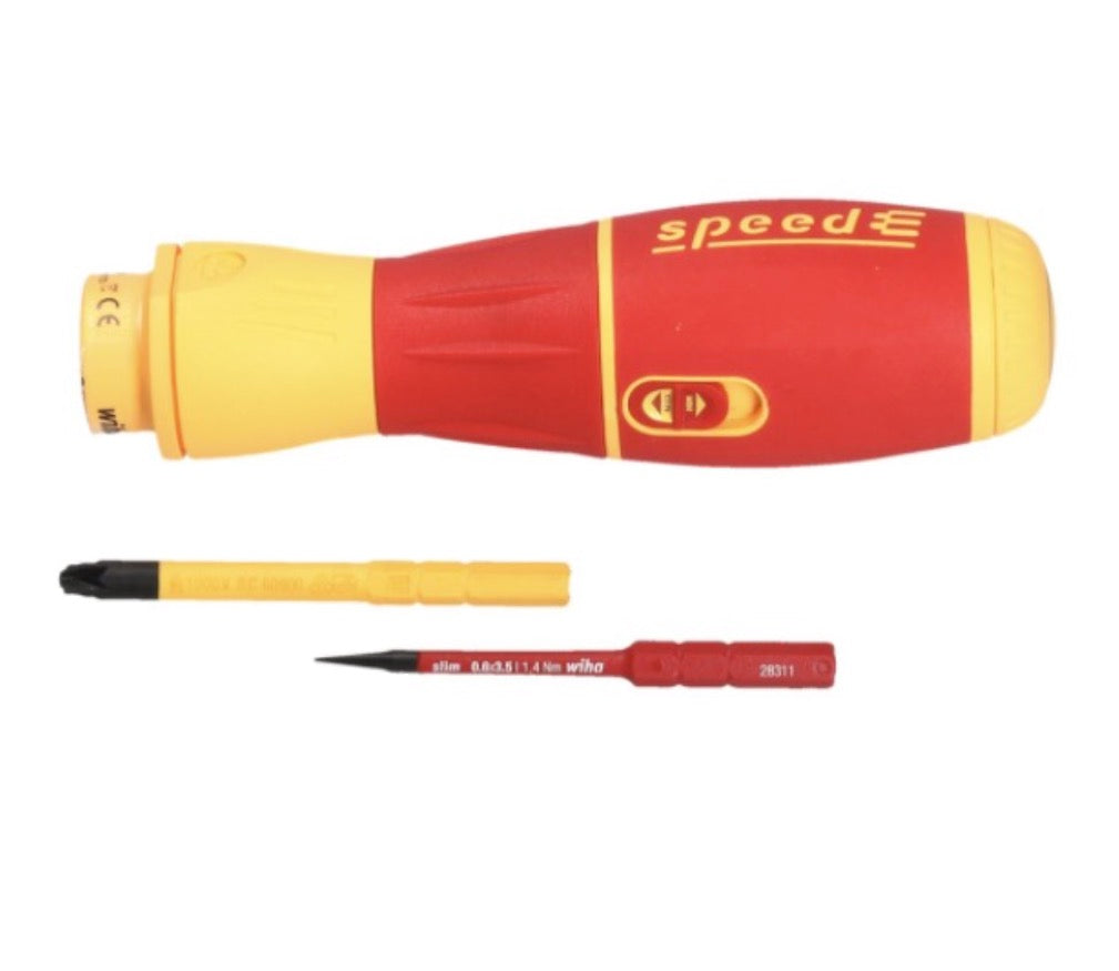 El Wiha speedE II triplica su velocidad de trabajo. El destornillador eléctrico de alta calidad facilita mucho el trabajo a cualquier artesano. Las consecuencias para la salud del atornillado manual incluyen: dolor en la muñeca, inflamación de los tendones y mucho más. El speedE II permite minimizar esto de manera efectiva. La combinación de facilidad de trabajo y mango ergonómico convenció a los médicos y terapeutas de la AGR. La sofisticada tecnología en el núcleo del destornillador es ideal para uniones atornilladas delicadas. La función de protección de material integrada garantiza una desconexión con 0,4 Nm y, si es necesario, el usuario puede apretar con cuidado los últimos milímetros con la mano. Además, por supuesto, el speedE también dispone de un interruptor deslizante que permite atornillar con 1 Nm, lo que permite realizar trabajos de atornillado más potentes. Y si todo esto no fuera suficiente, por supuesto se pueden realizar atornillados manuales de hasta 12 Nm sin dañar el destornillador. El speedE también está diseñado para entornos de trabajo con poca iluminación; tiene una luz LED integrada que siempre proporciona las mejores condiciones de iluminación posibles. Lo que también destaca es su aún mejor facilidad de uso, el gran interruptor de anillo y su muy buena concentricidad. Como puede ver, la combinación de trabajo extenuante es posible manteniendo la salud. Ya sea instalando enchufes, trabajando en el armario eléctrico, en trabajos industriales, en trabajos generales de motores, en el ámbito de las instalaciones de climatización e instalaciones sanitarias o en el ámbito doméstico, el speedE II facilita mucho el trabajo a todos los usuarios. Los slimBits aislados incluidos son ideales para aplicaciones eléctricas. Gracias a su tecnología estilizada se puede acceder fácilmente incluso a elementos de tornillo y resorte profundos. Esto es posible gracias al aislamiento protector integrado en la zona frontal de la broca. Los slimBits pueden garantizar un trabajo seguro en piezas bajo tensión de hasta 1000 V CA. Los slimBits no sólo son compatibles con este destornillador, sino también con todas las demás herramientas slimVario. No son aptos para el funcionamiento de máquinas. El juego slimBit de 6 piezas aumenta la eficiencia, ya que gracias al amplio sistema de cuchillas intercambiables se ahorra un enorme espacio. Los bits también están probados por VDE.