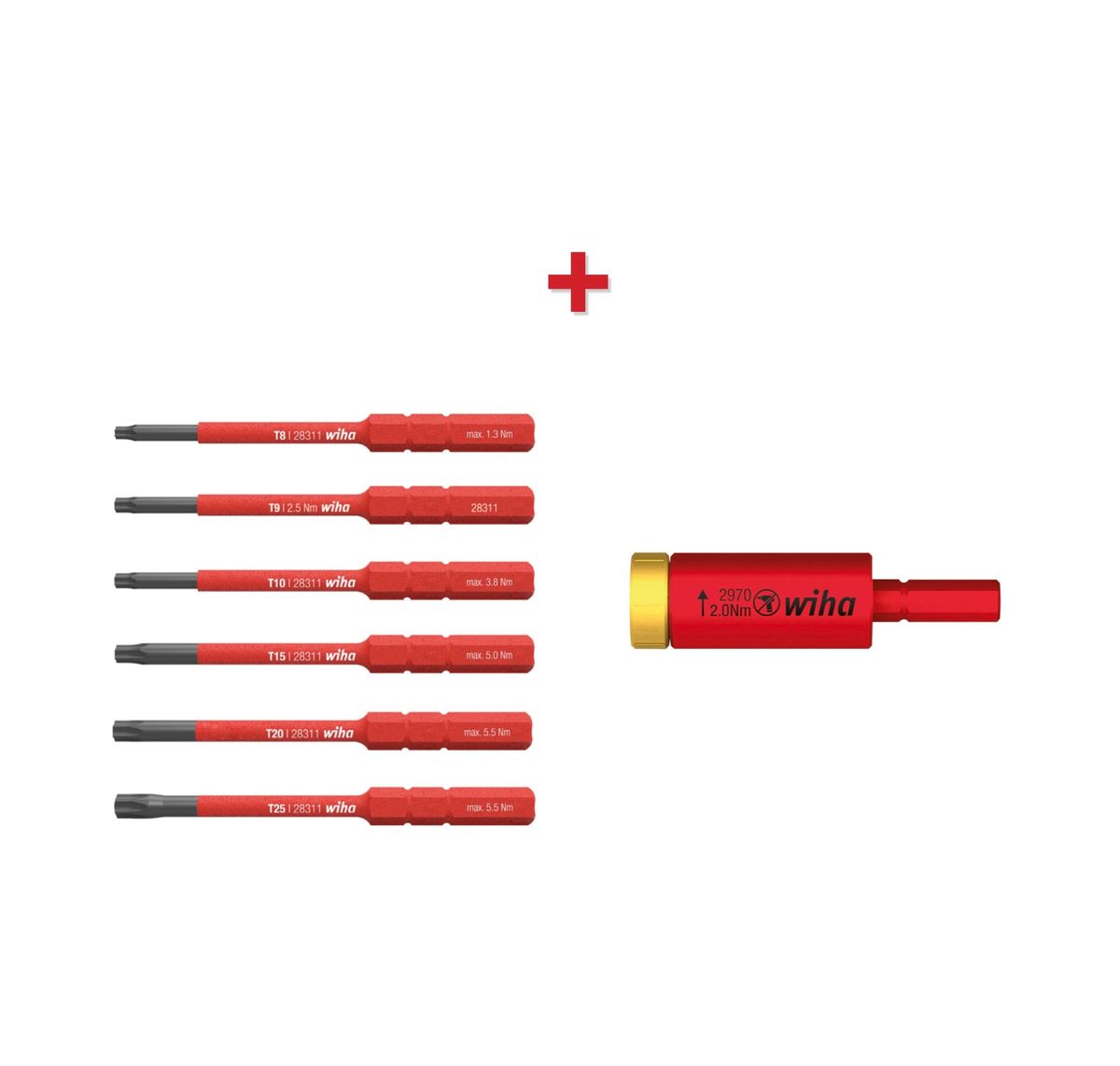 Wiha speedE® Set 1 Juego de destornilladores eléctricos / 10 unidades en caja L-Boxx Mini / Cargador + 2 pilas ( 41911 ) + Adaptador easyTorque + Juego de puntas slimBit electric Torx / 6 unidades