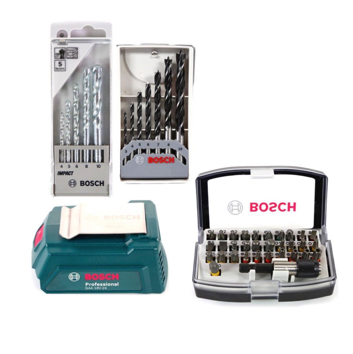 Bosch GSB 18-2-Li Plus Professional 18 V Perceuse-visseuse à percussion sans-fil avec Coffret + 2x Batteries GBA 6,0 Ah + Chargeur + 32 embouts de vissage + 5 Forets à matériaux + 7 Forets à bois + Adaptateur USB pour Batterie