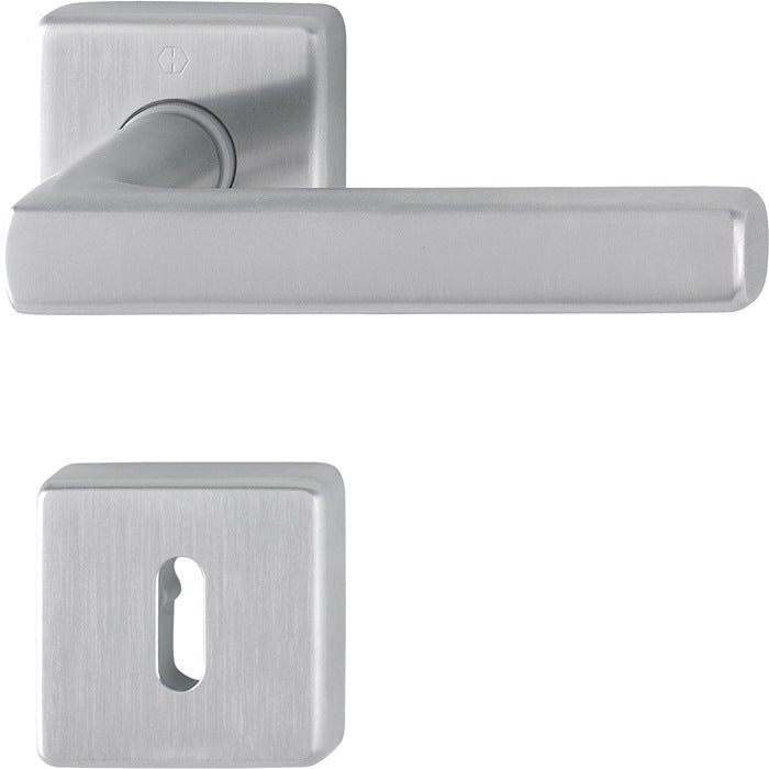 Garniture de rosace de porte intérieure testée selon DIN EN 1906 (catégorie d'utilisation classe 3) - Poignées de porte avec assemblage à goupille rapide (carré de 8 mm) pour épaisseur de porte 37-42 mm et ressort de rappel - Rosaces avec cames d'appui vissées de manière invisible - Acier inoxydable mat - Sens d'ouverture DIN gauche / droite