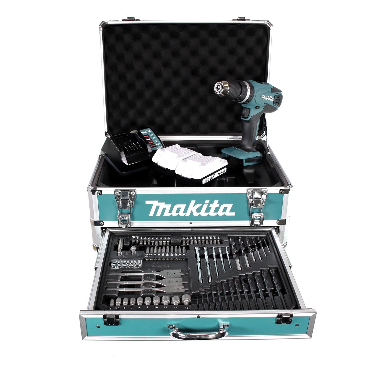 Makita HP 457 DWEX4 Perceuse-visseuse à percussion sans fil 18V 42Nm G-Serie + 2x Batteries 1,5Ah + Chargeur + 70 Forets et bits + Coffret