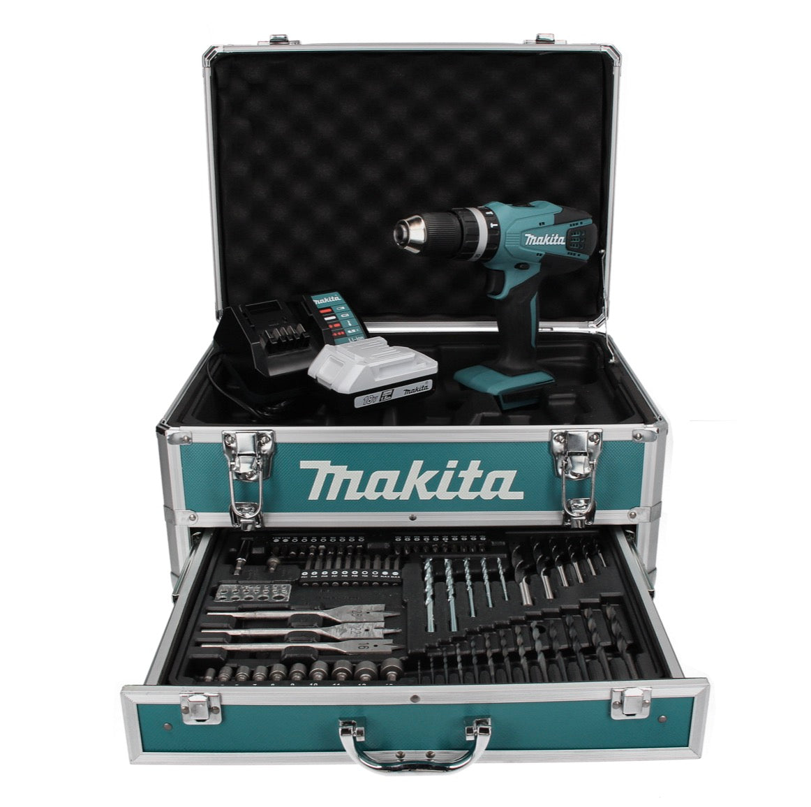 Makita HP 457 DWX4 Perceuse à percussion sans fil 42 Nm Série G 18 V + 1x Batterie 1,5 Ah + Chargeur + Coffret de mèches, 70pcs. + Coffret
