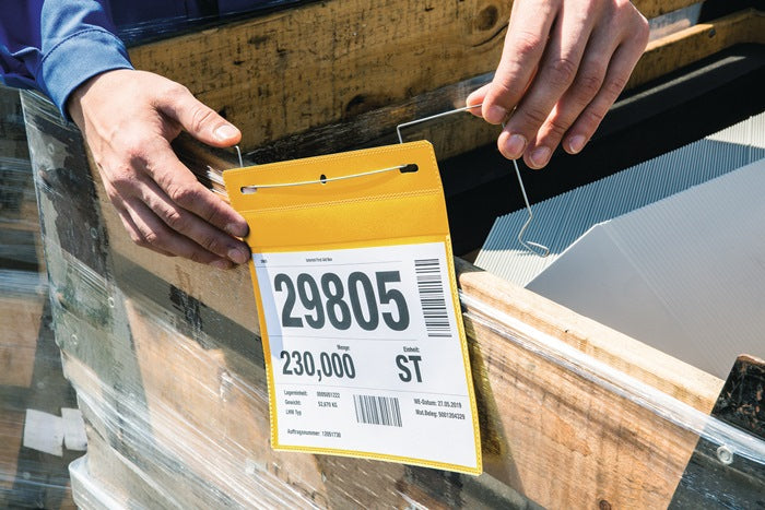 mit flexiblem Drahtbügel · strapazierfähige Tasche aus PP-Folie · scannertauglich und dokumentenecht · auch eignet für den Außeneinsatz durch Staub- und Regenschutzklappe · zur idealen Befestigung an Holzaufsatzrahmen und Palettenkartons · Vorderseite transparent · VE = 50 Stück