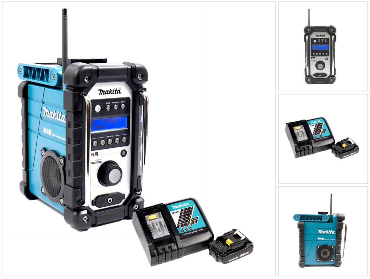Das DMR 104  Baustellen Radio in Grün von Makita überzeugt durch seine hohe Klangqualität der 3-Zoll Stereo-Lautsprecher und Robustheit des Gehäuses. Das mit einem Tragegriff ausgestattete Gehäuse ist an den äußeren Rändern gummiert und jegliche Öffnungen Staub- und Schmutzfest verschlossen. Zudem ist ein Schutz gegen allseitiges Spritzwasser gemäß IPX 4 garantiert. Das Baustellenradio empfängt Kanäle im FM / DAB Bereich über eine mitgelieferte flexible Stabantenne. Ein Großes LCD-Display mit Beleuchtung ermöglicht eine einfache manuelle oder vollautomatische Sendereinstellung. Der Sendersuchlauf und die Lautstärkeregelung werden vereinfacht über einen Drehknopf gesteuert und reduzieren den Umgang mit dem Radio aufs einfachste. Auf jedem Band können bis zu 5 Sender voreingespeichert werden. Sollte der Musikwunsch nicht im Radio zu finden sein, besitzt das DMR 104 auch AUX- und Micro-USB - Anschlüsse, um den eigenen iPod, MP3 oder CD-Player anzuschließen. Das Radio kann über gängige 7,2 - 18 Volt Makita Einschub- und Aufsteckakkus oder über den mitgelieferten Netzadapter betrieben werden. Mit dem BL 1820 Einschub-Akku läuft das Radio ca. 10 Stunden. Das mitgelieferte Schnellladegerät DC 18 RC lädt den BL 1820 Akku in ca. 25 Minuten.