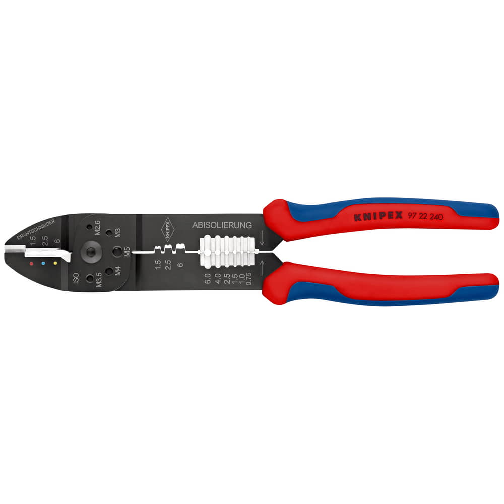 per tagliare cavi, spelare fili e crimpare capicorda e connettori isolati e non isolati e connettori aperti - con fori filettati per tagliare spine filettate in rame e ottone M 2,6 / 3 / 3,5 / 4 / 5 - in acciaio speciale ad alta resistenza verniciato nero - con guaine multicomponente