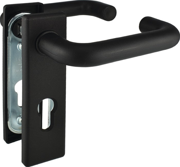 testato secondo DIN 18273 - con 2 viti di fissaggio - perforazione PZ - distanza 72 mm - quadro 9 mm - maniglia a leva fissa/girevole - piastre di fondo in acciaio e coperture in plastica - inclinazione - per porte di spessore 40-66 mm - utilizzabile DIN sinistra/destra - colore nero