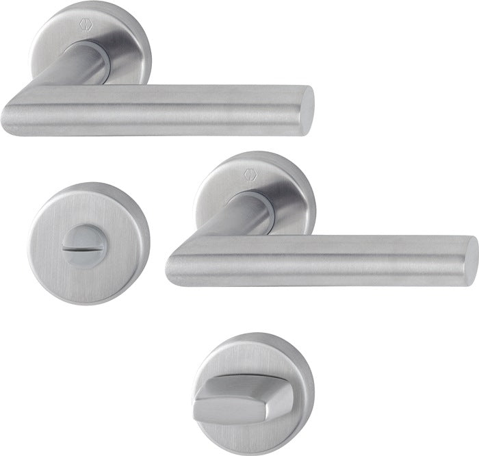 Zestaw rozet do drzwi wewnętrznych testowany zgodnie z normą DIN EN 1906 (klasa użytkowania 3) - Stal nierdzewna, matowa - Klamki z szybkozłączem (z pełnym trzpieniem 8 mm) do drzwi o grubości 37-42 mm - Rozety z plastikową konstrukcją nośną, sprężyną powrotną i krzywkami podpierającymi - Ukryte, ciągłe mocowanie śrubowe z samogwintującymi śrubami gwintowanymi - Kierunek zatrzymania DIN lewy / prawy