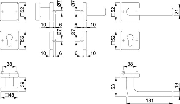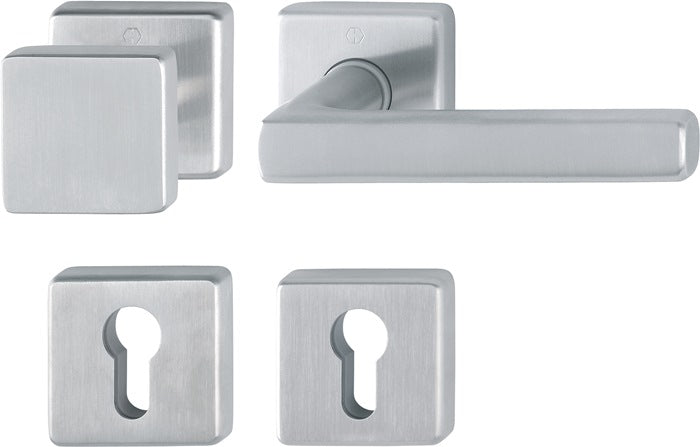 Zestaw rozet do drzwi wewnętrznych testowany zgodnie z normą DIN EN 1906 (klasa użytkowania 3) - Klamki z szybkozłączem (kwadrat 8 mm) do drzwi o grubości 37-42 mm i sprężyną powrotną - Rozety z krzywkami podpierającymi niewidocznie przykręcone - Matowa stal nierdzewna - Kierunek zawiasów DIN lewy / prawy