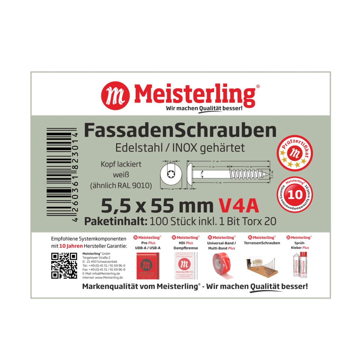 Meisterling Fassadenschrauben 5,5x55 mm 100 Stück ( 010030000411 ) 12 mm Flachkopf weiß mit Torx Teilgewinde V4A Edelstahl