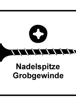 - 1x SPAX Schnellbauschrauben Grobgewinde magaziniert, 3,9x25 mm, 1000 Stück, Vollgewinde, Trompetenkopf, Kreuzschlitz H2, Nadelspitze, Phosphatiert schwarz ( 1891170390256 )