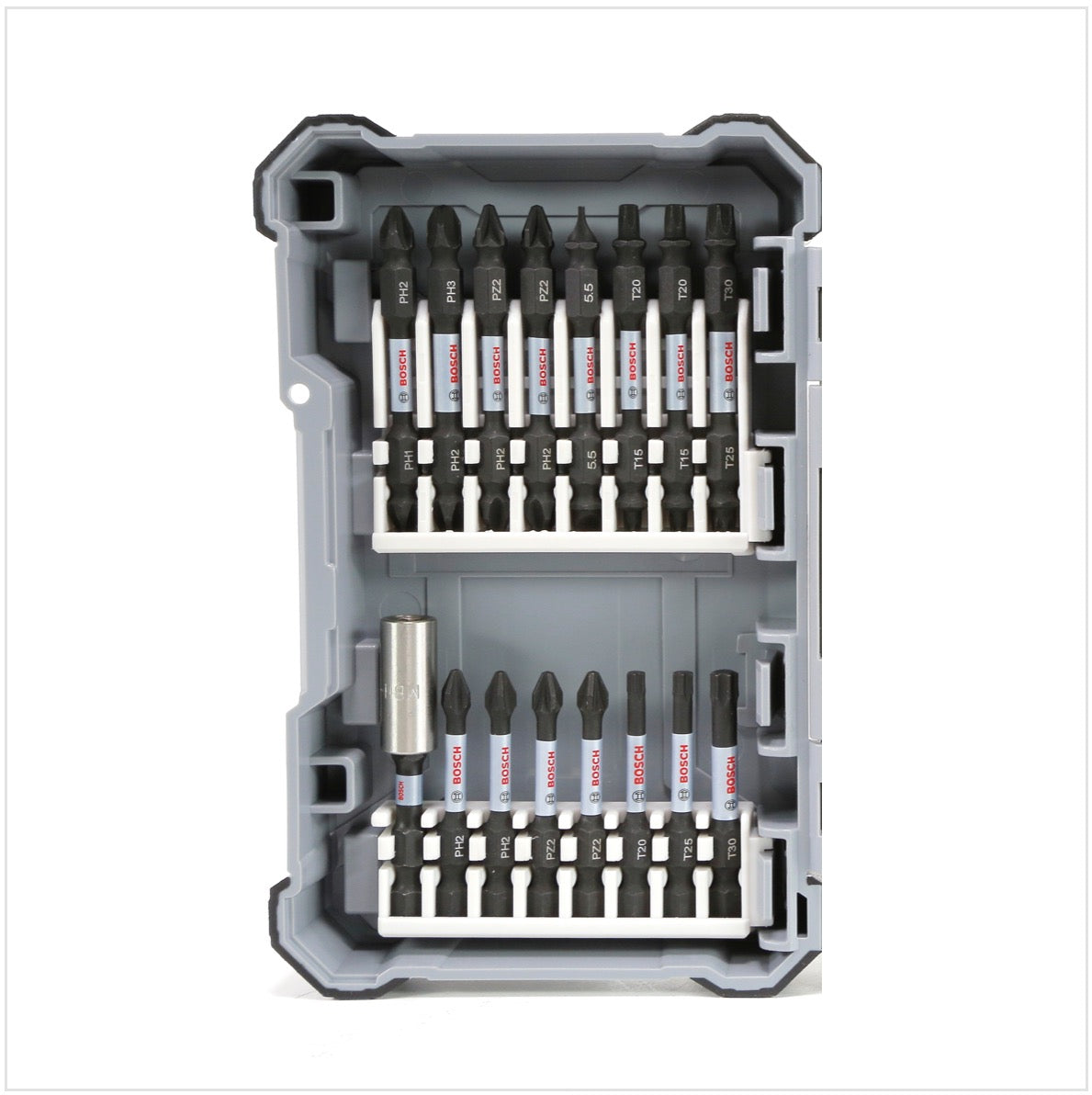 Das Bosch Impact Controll Schrauber-Bit Set besteht aus insgesamt 36 Komponenten von Steckschlüsseln, Schrauberbits, Doppelklingen und Universalhaltern. Die Bits sind dank Lasermarkierung schnell zu erkennen und durch die erweiterte Torsionszone extrem beständig und langlebig. Das wirklich robuste Zubehör eignet sich für alle gängigen Drehschlagschrauber.