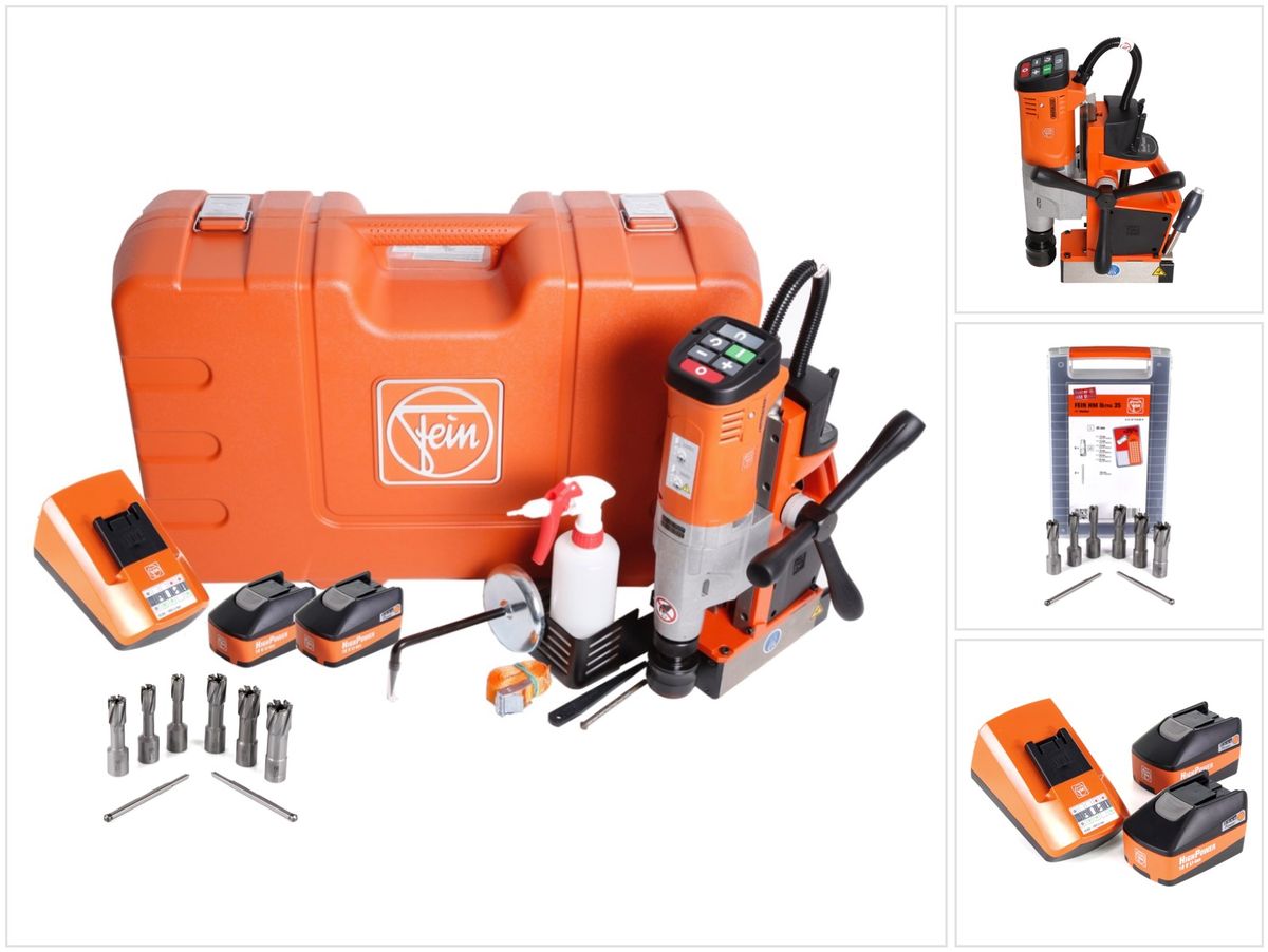 Diese Magnet Kernbohrmaschine aus dem Hause FEIN hat ein extrem verschleißfestes Maschinenkonzept mit schwenkbar gelagertem Motorkabel-Schutzschlauch und ist somit für den harten Einsatz in Industrie und Handwerk bestens geeignet. Diese kleine und leichte Maschine sorgt für  einen dauerhaft hohen Arbeitsfortschritt dank des bürstenlosen FEIN PowerDrive Motors mit Tachoelektronik. Zudem ist eine hohe Flexibilität bei allen mobilen Bohrarbeiten wie Kern-, Spiral-, Gewindebohren, Senken und Reiben gegeben. Das einfache und verwechslungsfreie Bedienkonzept steht im Blickfeld des Anwenders. Das Gerät hat zudem eine Komfort-Magnethaltekraftanzeige, einen Kippsensor, Rechts- und Linkslauf, eine elektronische Drehzahleinstellung, einen extra großen Hubbereich und eine MK2-Werkzeugaufnahme. Zudem ist ein extra schmaler Permanent-Magnet mit Vormagnetisierung vorhanden. Der Drehzahlspeicher  hat eine "Memory Function". Die FEIN SafetyCell Technology schützt den Akku und die Maschine vor Überlastung, Überhitzung und Tiefentladung. Die Kernbohrmaschine kommt in einem umfangreichen Set mit zwei leistungsstarken Akkus, einem passenden Ladegerät und einem achtteiligen Bohrerset mit unterschiedlichen Bohrdurchmessern und zwei Zentrierstiften.