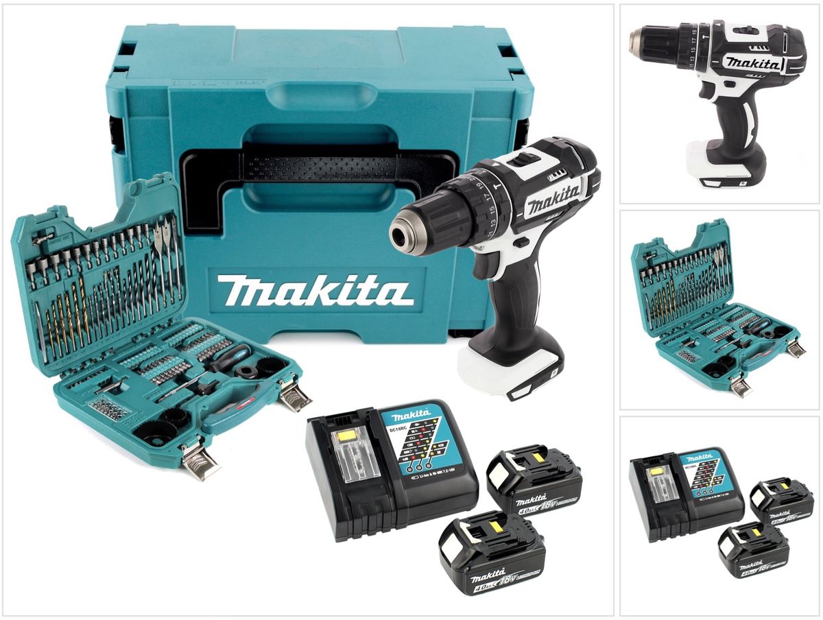 Makita DHP 482 RMJW Akku Schlagbohrschrauber 18 V 62 Nm weiß + 2x Akku 4,0Ah + Ladegerät + 100 tlg. Bit & Bohrer Set + Makpac