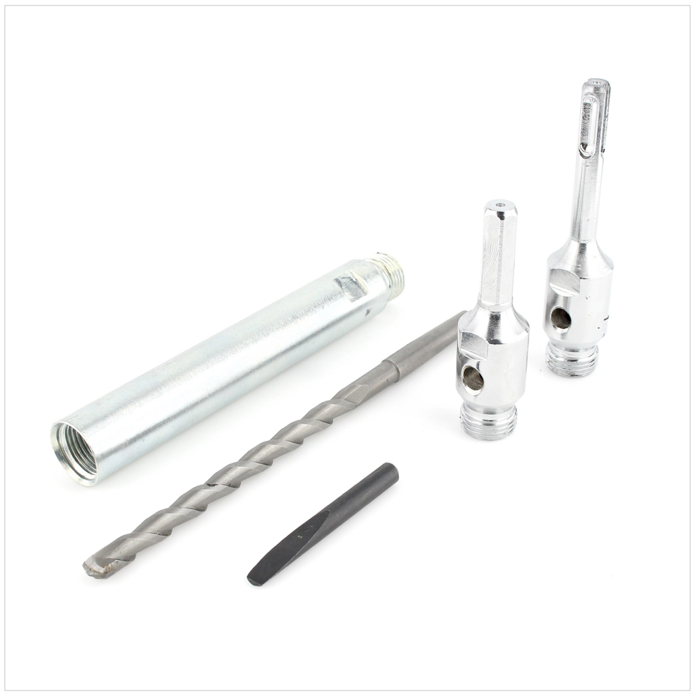 Das Zubehör-Set für  Makita Diamak Trockenbohrer besteht aus einer SDS-Aufnahme, einer Sechskant-Aufnahme, einer 150 mm Rohrverlängerung und einem 10 mm Führungsbohrer zum exakten Anbohren. Es ist für den Gebrauch von Makita Diamak Trockenbohrern geeignet, welche sich hervorragend zum Bohren in Granit, Marmor, Kalkstein, Schiefer, Hartstein und in weiteren dichten und nicht zerspanbaren Materialien eignen.