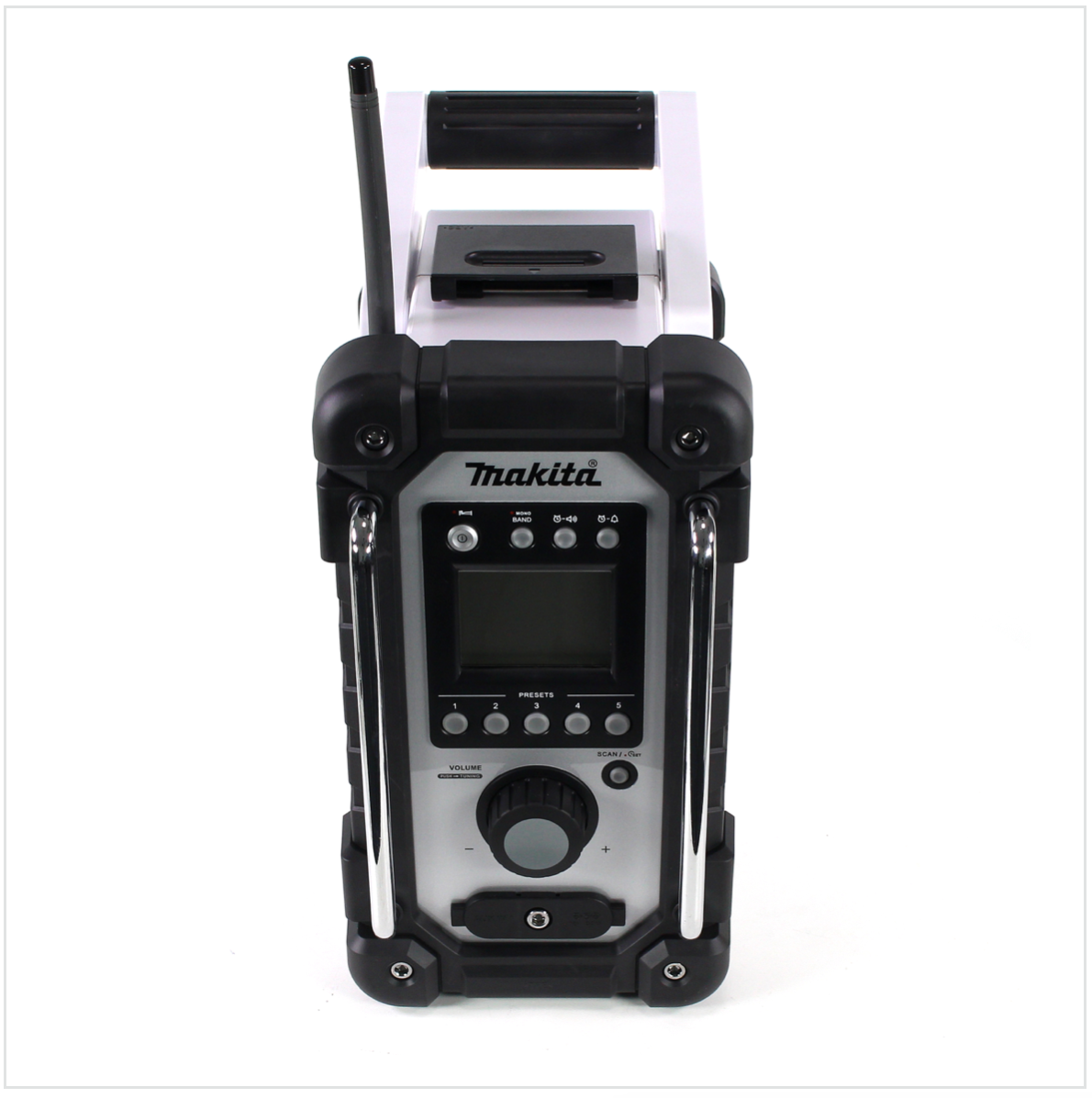 Das DMR 102 W ist die praktische Lösung für Musik unterwegs. Der Betrieb erfolgt über Netzteil oder Makita-Akkus von 7,2 bis 18 Volt. Das DMR 102 W ist spritzwassergeschützt und verfügt über einen elastischen Rundum-Stoßschutz, einen rutschfesten schwenkbaren Tragegriff sowie eine biegsame Antenne. Die Bedienelemente sind durch zwei Metallrohre geschützt. Das Radio kann bis zu fünf Senderplätze speichern, hat eine Uhr mit Weckfunktion und einen Kopfhöreranschluß. Die Ausgangsleistung der Stereo Boxen beträgt bei 18 Volt Akkubetrieb 2x 3,5 Watt. Mit dem BL 1850 Einschub-Akku läuft das Radio ca. 33 Stunden.