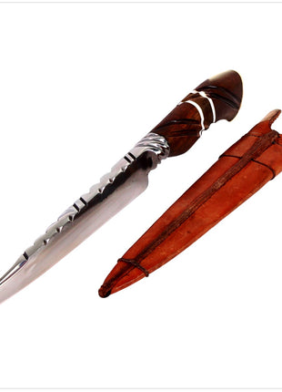 Ein wunderschönes Küchenmesser mit verspieltem Griff aus der hochwertigen Messerfertigung Serra Grande: Dieses handgefertigte Faca Bruta, was übersetzt soviel bedeutet wie "raues Küchenmesser", ist ein Must-have für jeden fleischbegeisterten Gaucho. Die Klingenlänge von 20,3 Zentimetern und die Klingenstärke von 6 Millimetern machen das Messer zu einem unverwüstlichen Alleskönner. Um höchsten Ansprüchen zu genügen, werden nur die besten Werkstoffe bei der Fertigung verwendet: Die Klinge besteht aus dem rostfreiem Schwedenstahl ( X46Cr13 / AISI 420 C ) der auch in der Solinger Messerfertigung benutzt wird. Dieser Edelstahl wird in der Fabrikation von Hand gehärtet und poliert, so daß eine edle und glänzende Optik entsteht. Der edle Griff wird aus dem Holz des Imbuia gefertigt, auch Pfefferbaum oder brasilianische Walnuß genannt. Das dunkelbraune Holz mit seiner kleinporigen Struktur weist dunkle Streifungen auf und wirkt optisch wie Nussbaumholz, obwohl es sich nicht um einen Nußbaum handelt. Es ist hart und langlebig, durch die sorgfältige Trocknung, Glättung und Politur überzeugt es mit einer wunderbaren Griffigkeit.